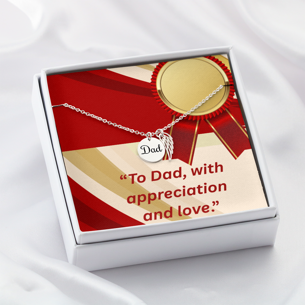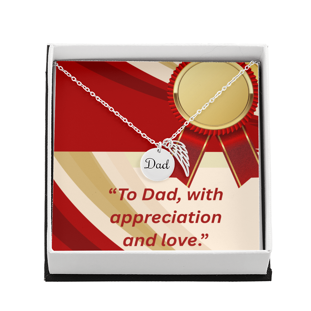 Carry your cherished memories of Dad with you always, thanks to our heartfelt Memorial Necklace. The word "Dad" is elegantly engraved on a delicately hand-polished coin, accented with black enamel for a striking contrast. This coin is beautifully paired with a delicate, polished Angel Wing tag, creating a meaningful and stylish accessory that keeps Dad's spirit close to your heart.